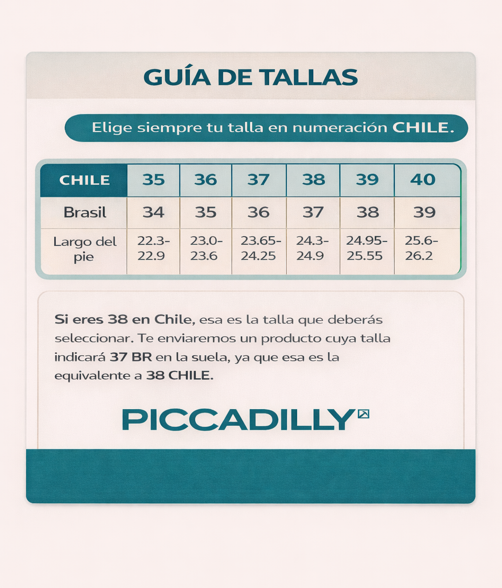 • Debes seleccionar tu talla Chilena. La talla que utilizamos en Piccadilly Chile es MER.
